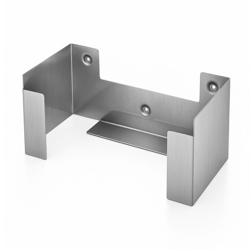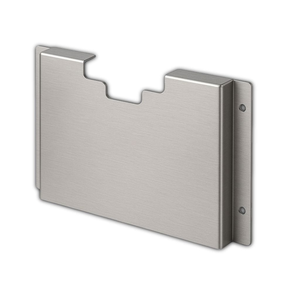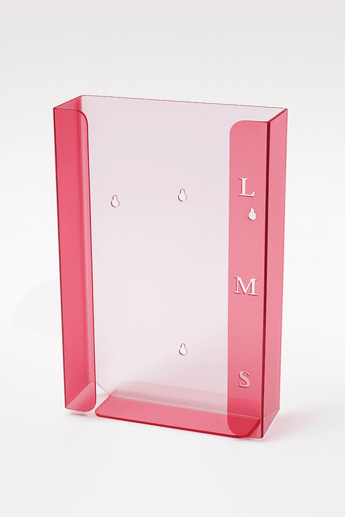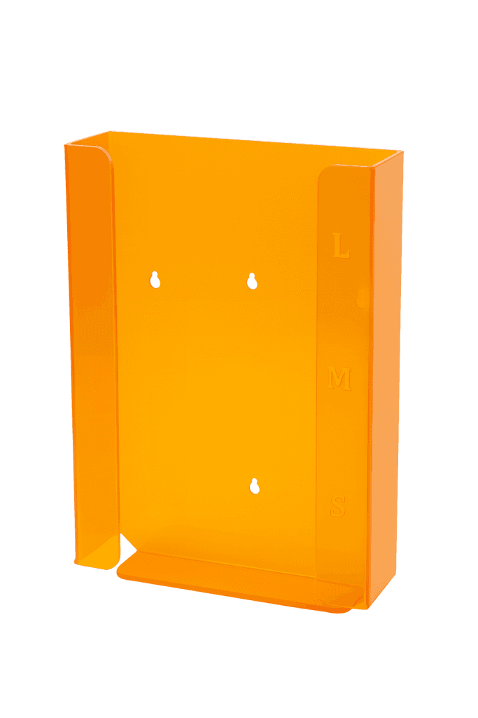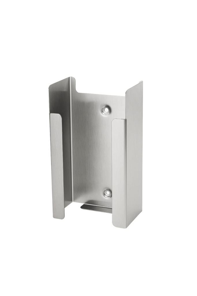 - Tek karton eldiven kutusu için dar üstü açık şeffaf akrilik tutucu; paslanmaz çelik muhafaza içinde duvara monte edilir.